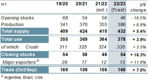 Прогнозируется, что мировое производство сои в 2022/23 году, почти полностью обусловленное более высокими урожаями в Южной Америке, вырастет на 9% в годовом исчислении, достигнув нового пика. В дополнение к значительному увеличению общего использования, рекордные запасы позволят в некоторой степени нарастить запасы, хотя рост в категории основных экспортеров будет ограничен более жестким балансом США. Прогнозируется, что мировая торговля вырастет примерно на 10 млн т в год, хотя и не дотянет до рекордного уровня 2019/20 гг.
