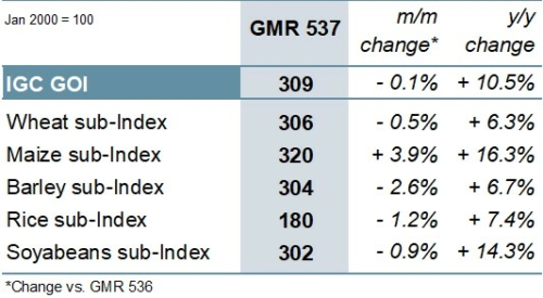 Индекс IGC Grains and Oilseeds (GOI) практически не изменился по сравнению с предыдущим месяцем, но все еще на 11% выше г/г.