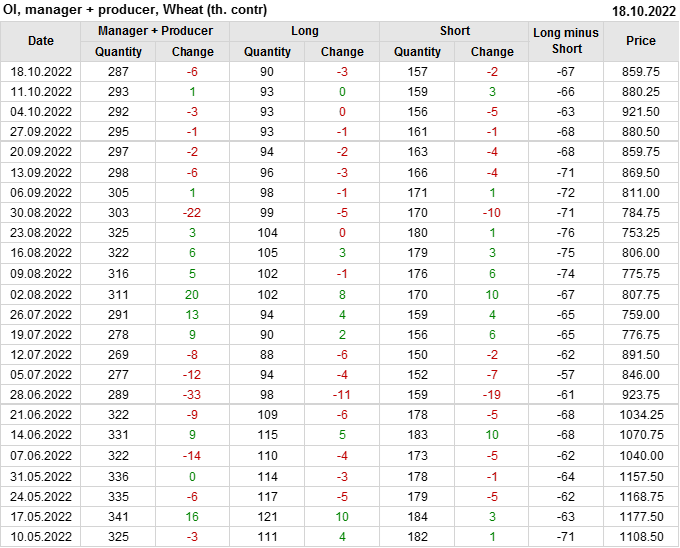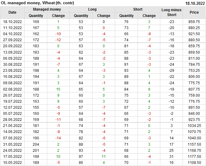 За прошедшую неделю, 12.10.22 — 18.10.22, разница между длинными и короткими позициями управляющих увеличилась на 3.1 тыс. контрактов. В тоже время, цена упала на 20.5 цента.
