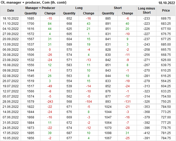 За прошлую неделю, 12.10.22 — 18.10.22, разница между длинными и короткими позициями управляющих сократилась на 15.2 тыс. контрактов. В тоже время, цена выросла на 6.5 цента.