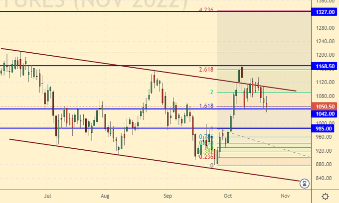 Сценарий роста: рассматриваем ноябрьский фьючерс, дата экспирации 10 ноября. Снова будем рекомендовать покупки. Ситуация с топливом из-за конфликта между Западом и Россией будет непростой.
