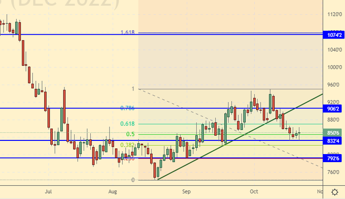 Продажа: нет. Кто в позиции от 853.0, перенесите стоп на 863.0. Цель: 820.0 (750.0) центов за бушель.