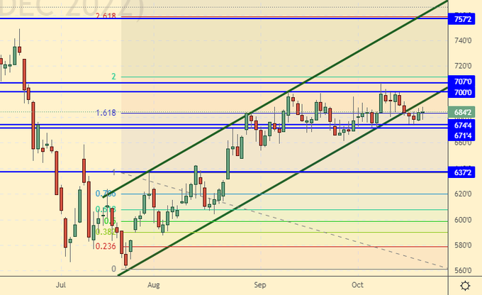 Сценарий роста: рассматриваем декабрьский фьючерс, дата экспирации 14 декабря. Пока быкам удается оборонять уровень 670.0, они будут в безопасности, но если он будет пробит вниз, то может начаться быстрое закрытие стоп-ордеров, что приведет к сильному падению. Лонги держим, новые позиции не открываем.