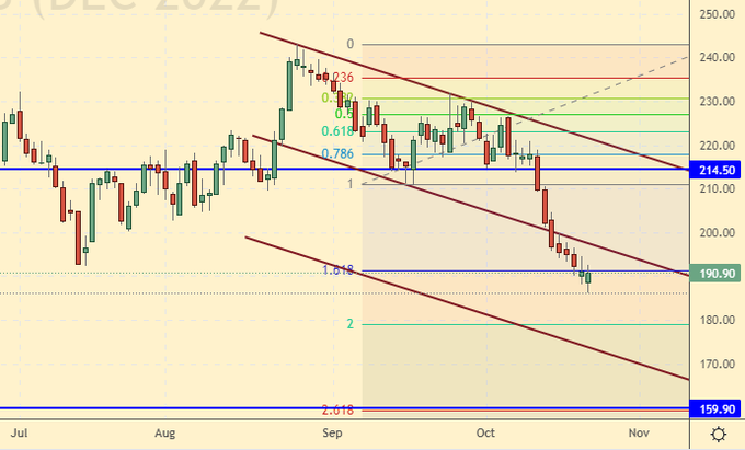 Продажа: при подъеме к 210.0. Стоп: 223.0. Цель: 160.00. Кто в позиции от 220.0, перенесите стоп на 193.00. Цель: 150.00 центов за фунт.