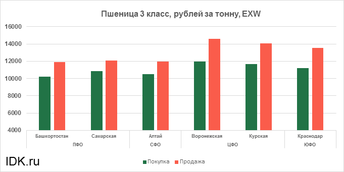 За прошедшую неделю с 17.10.2022 по 21.10.2022 средняя цена на пшеницу 3-го класса, согласно выставленным заявкам трейдеров, упала по всем округам на 16 рублей. Средняя цена составляет 11984 рубля за тонну.