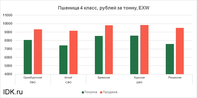 За прошедшую неделю с 17.10.2022 по 21.10.2022 средняя цена на пшеницу 4-го класса, согласно выставленным заявкам трейдеров, упала по всем округам на 281 рубль. Средняя цена составляет 8681 рубль за тонну.