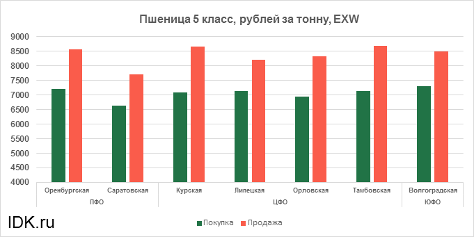 За прошедшую неделю с 17.10.2022 по 21.10.2022 средняя цена на пшеницу 5-го класса, согласно выставленным заявкам трейдеров, упала по всем округам на 210 рублей. Средняя цена составляет 7667 рублей за тонну.