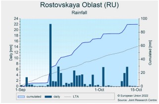 Частые дожди привели к задержке уборки кукурузы на зерно, что может привести к потере качества зерна. Это также привело к задержке сева озимых зерновых в центральных и восточных районах европейской части России. По данным Минсельхоза России, со ссылкой на УкрАгроКонсалт, к середине октября озимыми зерновыми было засеяно 13,1 млн га; это на 0,7 млн га меньше, чем в прошлом году в районе этой даты, но еще есть достаточно времени, чтобы наверстать упущенное.