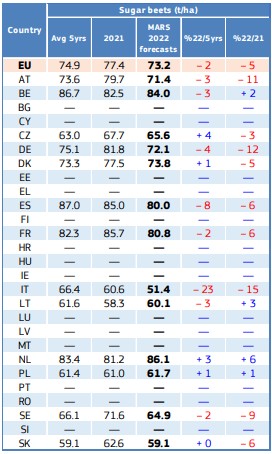 Прогноз урожайности сахарной свеклы (т/га) на 2022 г.