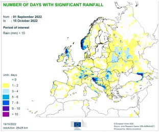 Засушливые условия (осадки ниже 5 мм) ожидаются на большей части территории Турции, на Балканах к югу от Карпат, на большей части Италии и вдоль средиземноморского побережья Испании, с осадками 0 дней выше 5 мм. Для большинства других районов Европы в рассматриваемый период прогнозируется до 2 дней с осадками выше 5 мм.