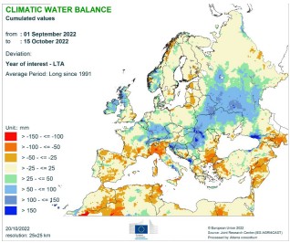 Более сухие, чем обычно, условия с аномалиями осадков -50% и более (относительно LTA) наблюдались в нескольких частях Испании, большей части северной Италии и части стран Балтии, а также в юго-восточной Болгарии, восточной Греции и западной Турции. В этих регионах наблюдалось только до 2 дней с осадками более 5 мм. Климатический водный баланс большей части северной Италии и юго-восточной Болгарии был на 50 мм и более ниже LTA.