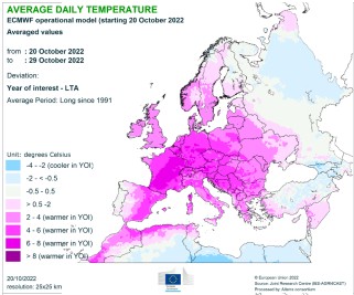 Несколько более теплые, чем обычно, погодные условия по сравнению с долгосрочным средним значением (LTA) за 1991–2021 годы наблюдались на большей части Пиренейского полуострова, во Франции и Италии, в некоторых частях Соединенного Королевства, на западных Балканах и вдоль побережья Черного моря в Болгарии и Румынии, а также на большей части Турции, юга, востока и самого севера европейской части России и части Скандинавии. Среднесуточные температуры в этих регионах были на 0,5–2 °C выше LTA. Более отчетливые положительные температурные аномалии (до 4°C выше LTA) наблюдались локально в некоторых частях Пиренейского полуострова и на юге Франции, а также на востоке Турции и на самом юге европейской части России.