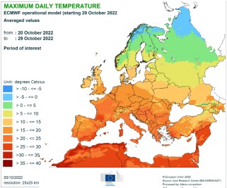 Более теплые, чем обычно, условия (относительно долгосрочного среднего значения за 1991–2021 годы — LTA) прогнозируются на большей части Европы, за исключением западной части Пиренейского полуострова, европейской части России и большей части Турции. Прогнозируется, что дневные температуры будут на 6-8 °C выше LTA в центральной Франции, некоторых частях Бельгии, Германии, Австрии и локально на западных Балканах. Максимальные дневные температуры выше 15 °C прогнозируются на большей части Европы, достигая 25-30 °C на юго-востоке Испании и во французских Пиренеях, а также в некоторых частях южной Италии.
