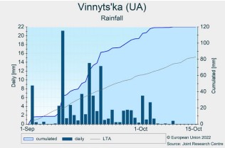 Более влажные, чем обычно, условия преобладали в северной половине Украины в течение рассматриваемого периода, с наиболее отчетливым избытком осадков в восточных областях (например, Харьковской, Луганской), тогда как в южных частях преобладали околосезонные осадки. Эти условия сочетались с температурами ниже среднего в сентябре, особенно в самых северных областях (например, в Черниговской), где наблюдалась отрицательная термическая аномалия от 2 °С до 4 °С. С тех пор температура вернулась к почти сезонным уровням.
