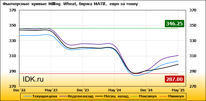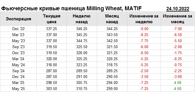 На 24.10.2022 стоимость пшеницы Milling Wheat на бирже MATIF по контракту Dec ’22 составила 337.25 евро за тонну. За прошедшую неделю стоимость пшеницы Milling Wheat упала на 9 евро/тонна. Как мы видим на графике, фьючерсная кривая имеет периоды, когда более дальний фьючерс дешевле ближнего. Состояние бэквардации наблюдаем на следующих контрактах: Mar ’23; Sep ’23; May ’24; Sep ’24. Таким образом, трейдеры предполагают, что возможно превалирование предложения над спросом в указанные периоды.