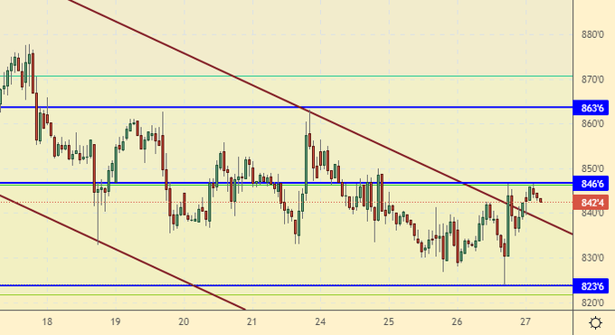 Вчерашнее ослабление доллара помогло рынку отскочить вверх от 823.0. Нельзя исключать попыток пробиться вниз, но на данный момент есть смысл держать открытые вчера лонги, так как если рынок выстоит, то нас будет ждать движение к 1070.0.