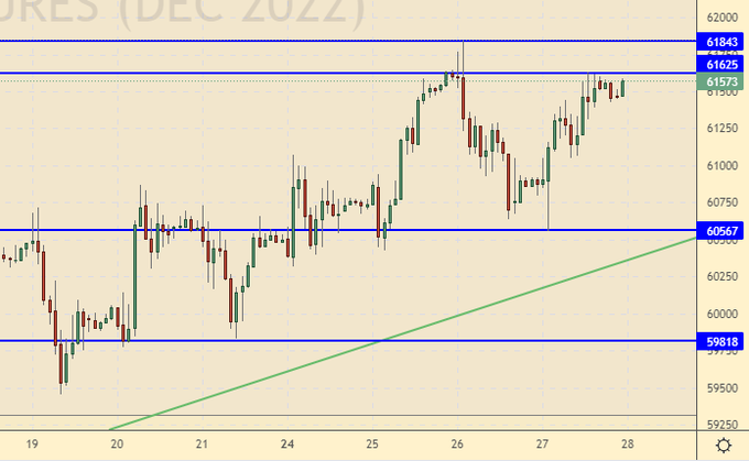 Фьючерс ведет себя агрессивно, пытаясь растолкаться и выбраться выше 62000, однако пока спот стоит на месте сделать ему это будет трудно. Но в целом сохраняются предпосылки для движения вверх, так как рост расходов и сокращение поступлений в бюджет в 2023- м году при сохранении статус-кво весьма вероятны.