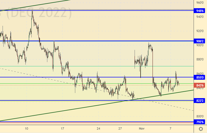 Рынок продолжает стоять над 820.0 не решаясь упасть, так как у трейдеров есть большие сомнения по поводу следующего сезона. Если Россия и Украина по тем или иным причинам перестанут поставлять зерно, то спрос на международном рынке будет колоссальным. При этом Европу будет ждать очередное нашествие голодных из Северной Африки и Ближнего Востока.