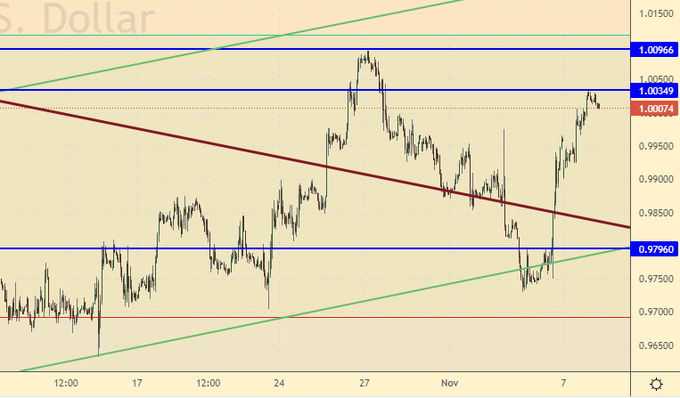 Пятничный рывок вверх выглядит подозрительно. Далеко не факт, что мы сможем закрепиться выше 1.0000. Можно рекомендовать продажи пары с текущих уровней, так как вероятность некой провокации с падением доллара в пятницу существует.