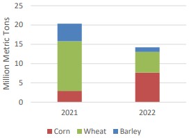 Большой урожай кукурузы в Украине в 2021 году побудил экспортеров немедленно искать альтернативные маршруты по суше, в основном в направлении Европейского Союза (ЕС), после того как ранее в этом году торговые пути были нарушены. Из-за обильных запасов экспорт кукурузы резко вырос в начале вновь открытых морских путей, особенно в ЕС, Турцию и Китай. Спрос ЕС на импорт кукурузы по морю и суше остается высоким из-за меньшего урожая, вызванного засухой. Учитывая дефицит фуражного зерна в ЕС, Испания была основным рынком сбыта украинского ячменя.