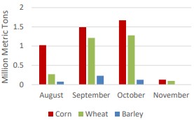 Экспорт зерна из Украины носит ярко выраженный сезонный характер. Экспорт достигает пика вскоре после сбора урожая пшеницы и ячменя в июле и сбора урожая кукурузы в сентябре. Несмотря на типичную сезонность, кукуруза была основным зерном, экспортируемым через коридор. Согласно украинским торговым данным, экспорт кукурузы всеми видами транспорта с июля по 8 ноября увеличился более чем вдвое по сравнению с предыдущим годом до 7,7 млн тонн, тогда как экспорт пшеницы на уровне 5,4 млн составляет менее половины уровня предыдущего года, в то время как экспорт ячменя в 1,2 млн составляет менее трети.