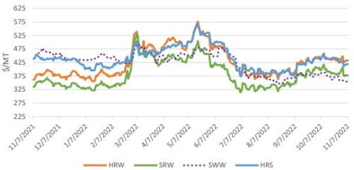 После октябрьского отчета WASDE котировки в США упали, отражая умеренный интерес импортеров, поскольку цены в США постоянно остаются выше, чем в других странах. Hard Red Spring (HRS) подешевела на 38 долларов за тонну по сравнению с прошлым месяцем до 419 долларов за тонну в соответствии со снижением цен в Канаде. Hard Red Winter (HRW) подешевела на 26 долларов за тонну до 433 долларов и по-прежнему нетипично котируется с премией к HRS. Soft Red Winter (SRW) подешевела на 41 доллар за тонну до 377 долларов за тонну из-за благоприятных посевов и продолжающегося наличия черноморского зерна на рынке. Soft White Winter (SWW) подешевела на 35 долларов за тонну до 354 долларов за тонну, отражая более глобальную доступность белой пшеницы.