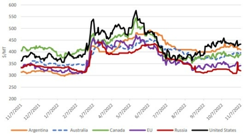 Мировые цены на пшеницу снизились на большинстве рынков после октябрьского отчета WASDE. Несмотря на высокий спрос на импорт и тендерную активность со стороны Ближнего Востока и Северной Африки, предлагающих поддержку, опасения по поводу глобальной рецессии, вызывающей замедление спроса, привели к снижению цен. Котировки в США испытали наибольшее снижение на $26/т. Котировки в ЕС упали на $17/т, поскольку поставки украинской пшеницы из Черного моря продолжаются. Канадские котировки упали на 13 долларов за тонну из-за большого урожая. Между тем, аргентинские котировки снизились всего на 10 долларов за тонну из-за понижения размера предстоящего урожая. Российские котировки снизились всего на $7/т из-за неопределенности экспортных возможностей Черного моря. Австралийские котировки, с другой стороны, выросли на 20 долларов за тонну благодаря высокому спросу со стороны Азии.