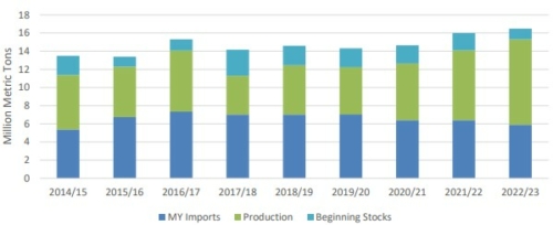 Производство пшеницы в Бразилии прогнозируется на уровне рекордных 9,4 млн тонн в 2022/23 году благодаря повышению урожайности. Имея достаточные внутренние запасы, импорт сокращается до 5,9 млн тонн — самого низкого уровня за 8 лет.