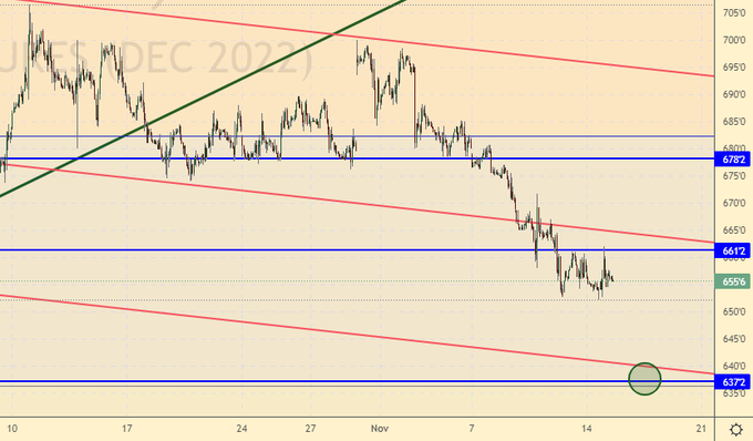 Кукурузы много. Спред между ней и пшеницей сейчас составляет 160 центов за бушель. Отметим, что он без труда сможет расширится до 200 центов. То есть, мы спокойно можем сходить к 640.0, при этом пшеница может оставаться на месте. От 640.0 покупать.