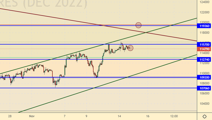 Продолжаются маневры по индексу РТС в районе 115000. Пока не можем пройти к 120000. Если такая ситуация сохранится сегодня, то у продавцов появится шанс на контратаку, скорее вечером, после выход данных по инфляции в США.