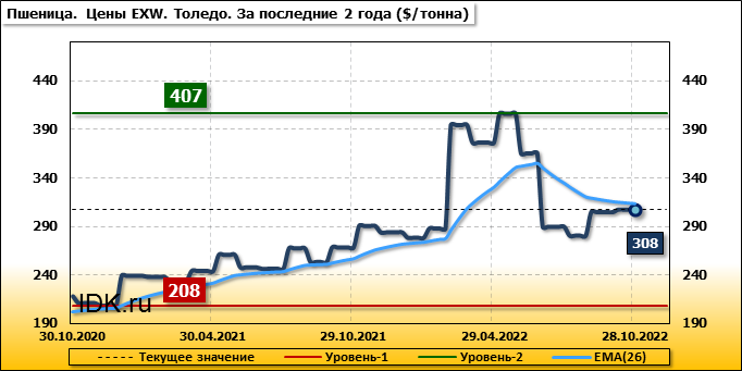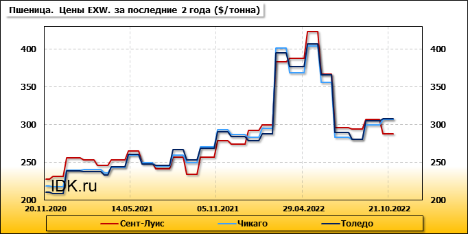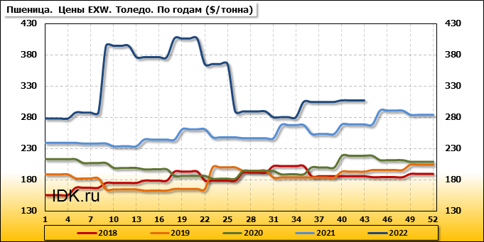 Внутренние цены на пшеницу SRW в городе Толедо (США) выросли на 2.6 $/т. и на отчетный месяц составляют 307.65 доллара за тонну.