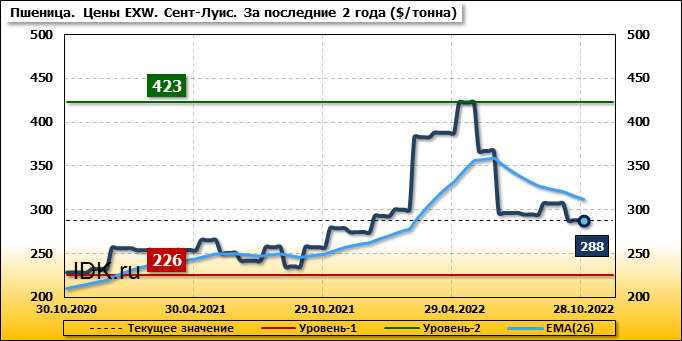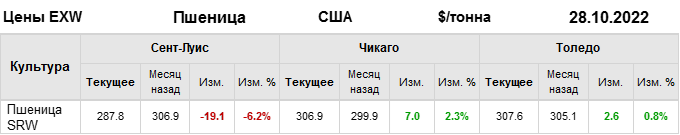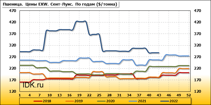 За прошедший месяц внутренние цены на пшеницу SRW в Сент-Луисе (США) упали на 19.1 $/т. и на отчетный месяц составляют 287.78 доллара за тонну.