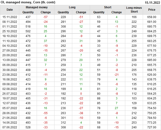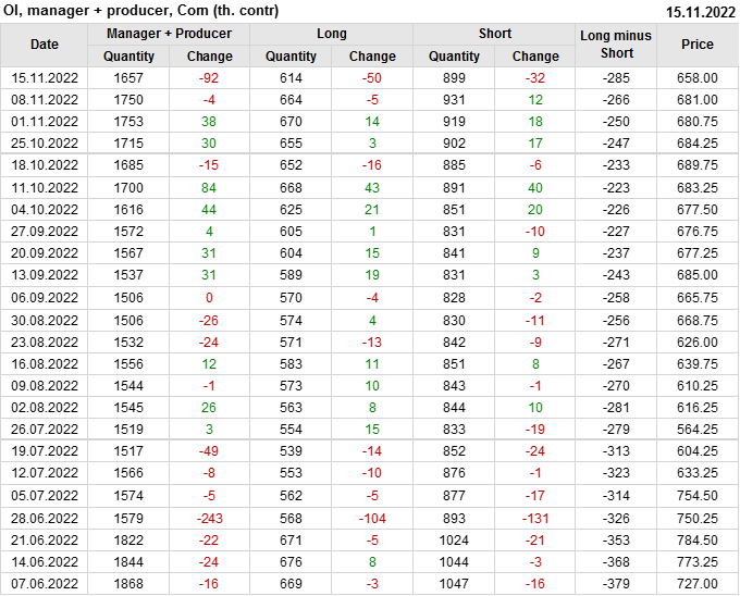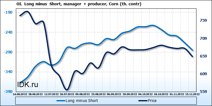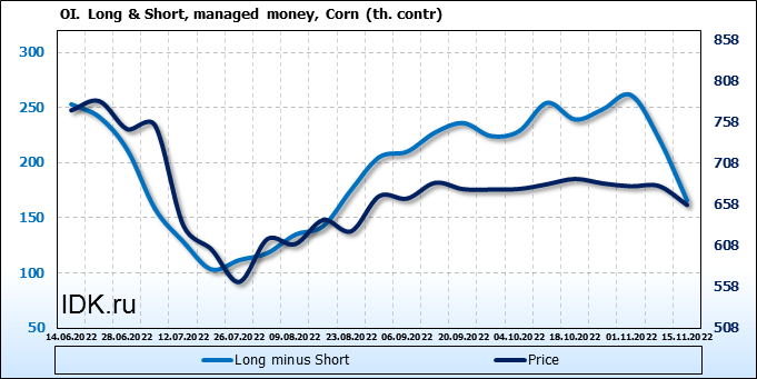 За прошлую неделю, 09.11.22 — 15.11.22, разница между длинными и короткими позициями управляющих сократилась на 56 тыс. контрактов. В тоже время, цена упала на 23 цента.