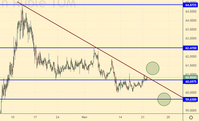 Покупка: при подходе к 59.60. Стоп: 59.20. Цель: 70.00. Кто в позиции от 60.60, перенесите стоп на 60.40. Цель: 70.00.