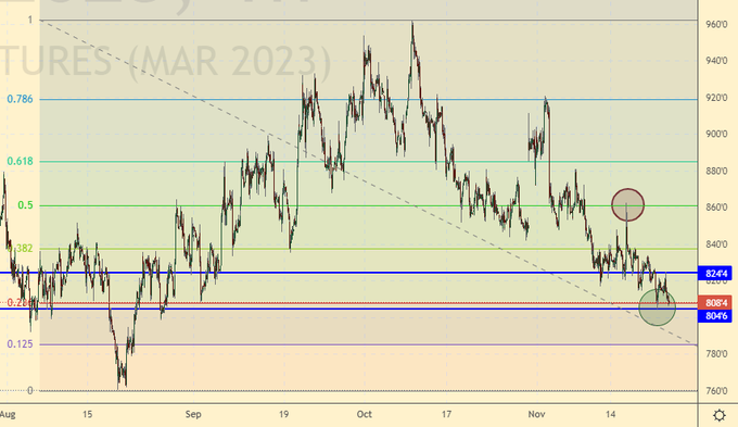 Если спотовый рынок продолжит оставаться на низких уровнях, то нам стоит ожидать и падения цен на бирже. Пшеница может уйти до уровня 700.0 центов за бушель, однако дальнейшее падение вряд ли будет возможно без нормализации ситуации на Украине.