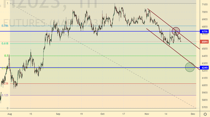 Есть вероятность продолжения падения цен до уровня 625.0. Имеет смысл поискать возможности для входа в шорт. Собранный урожай огромен, рано или поздно он должен был начать давить на цены.