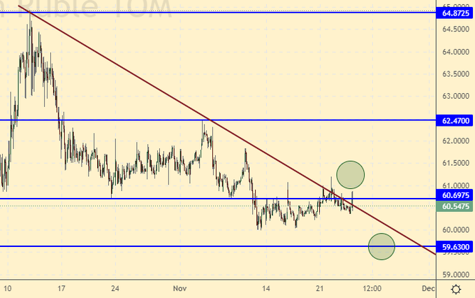 Покупка: при подходе к 59.60. Стоп: 59.20. Цель: 70.00. Кто в позиции от 60.60, держите стоп на 60.40. Цель: 70.00.