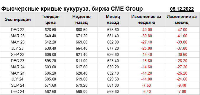 На 05.12.2022 стоимость кукурузы на бирже CME Group по контракту DEC 22 составила 628.6 цента за бушель. За прошедшую неделю стоимость кукурузы на площадке CME Group упала на 40 центов/бушель. Как мы видим на графике, фьючерсная кривая имеет периоды, когда более дальний фьючерс дешевле ближнего. Состояние бэквардации наблюдаем на следующих контрактах: JLY 23; SEP 23; DEC 23; JLY 24; SEP 24; DEC 24; Таким образом, трейдеры предполагают, что возможно превалирование предложения над спросом в указанные периоды.