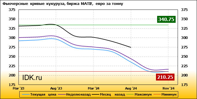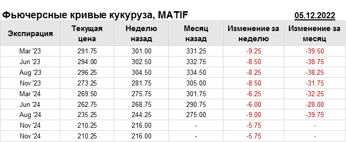 На 05.12.2022 стоимость кукурузы на бирже MATIF по контракту Mar ’23 составила 291.75 евро за тонну. За прошедшую неделю стоимость кукурузы на европейской площадке упала на 9.25 евро/тонна. Как мы видим на графике, фьючерсная кривая имеет периоды, когда более дальний фьючерс дешевле ближнего. Состояние бэквардации наблюдаем на следующих контрактах: Nov ’23; Mar ’24; Jun ’24; Aug ’24; Nov ’24. Таким образом, трейдеры предполагают, что возможно превалирование предложения над спросом в указанные периоды.