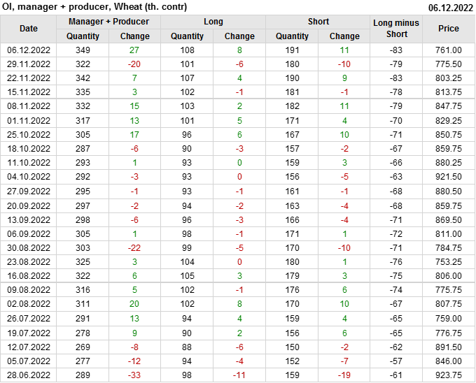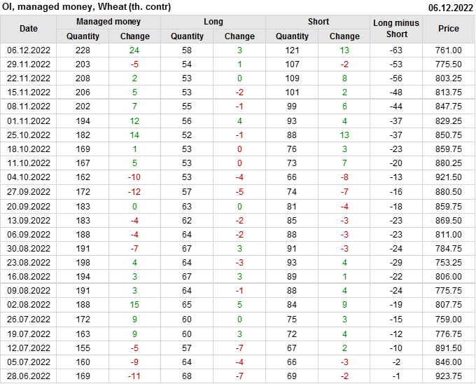 За прошедшую неделю, 30.11.22 — 06.12.22, разница между длинными и короткими позициями управляющих увеличилась на 10 тыс. контрактов. В тоже время, цена упала на 14.5 цента.