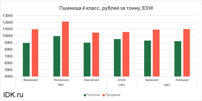 За прошедшую неделю с 05.12.2022 по 09.12.2022 средняя цена на пшеницу 4-го класса, согласно выставленным заявкам трейдеров, упала по всем округам на 712 рублей. Средняя цена составляет 10088 рублей за тонну.