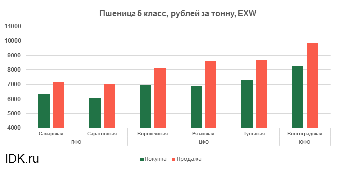 За прошедшую неделю с 05.12.2022 по 09.12.2022 средняя цена на пшеницу 5-го класса, согласно выставленным заявкам трейдеров, выросла по всем округам на 8 рублей. Средняя цена составляет 7797 рублей за тонну.
