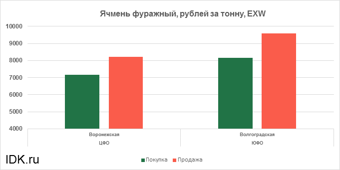 За прошедшую неделю с 05.12.2022 по 09.12.2022 средняя цена на фуражный ячмень, согласно выставленным заявкам трейдеров, упала по всем округам на 206 рублей. Средняя цена составляет 8278 рублей за тонну.
