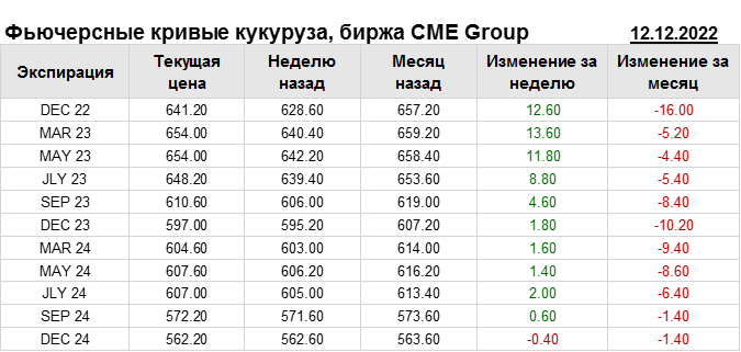 На 12.12.2022 стоимость кукурузы на бирже CME Group по контракту DEC 22 составила 641.2 центов за бушель. За прошедшую неделю стоимость кукурузы на площадке CME Group выросла на 12.6 цента/бушель. Как мы видим на графике, фьючерсная кривая имеет периоды, когда более дальний фьючерс дешевле ближнего. Состояние бэквардации наблюдаем на следующих контрактах: JLY 23; SEP 23; DEC 23; JLY 24; SEP 24; DEC 24. Таким образом, трейдеры предполагают, что возможно превалирование предложения над спросом в указанные периоды.