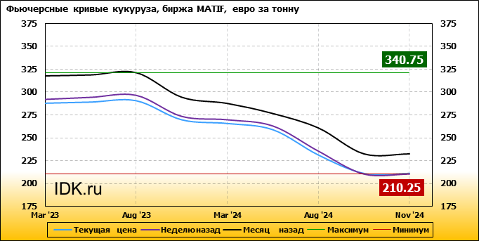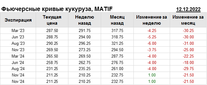 На 12.12.2022 стоимость кукурузы на бирже MATIF по контракту Mar ’23 составила 287.5 евро за тонну. За прошедшую неделю стоимость кукурузы на европейской площадке упала на 4.25 евро/тонна. Как мы видим на графике, фьючерсная кривая имеет периоды, когда более дальний фьючерс дешевле ближнего. Состояние бэквардации наблюдаем на следующих контрактах: Nov ’23; Mar ’24; Jun ’24; Aug ’24; Nov ’24. Таким образом, трейдеры предполагают, что возможно превалирование предложения над спросом в указанные периоды.