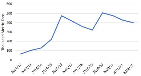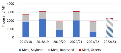 Это было в дополнение к TRQ в размере 650 000 тонн, который уже был введен в действие в августе 2021 г. Общий объем импорта соевого шрота в 2021/22 г. достиг 646 000 тонн, что почти втрое превышает объем предыдущего маркетингового года.