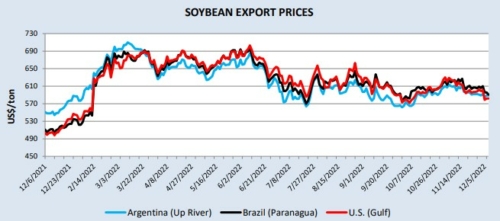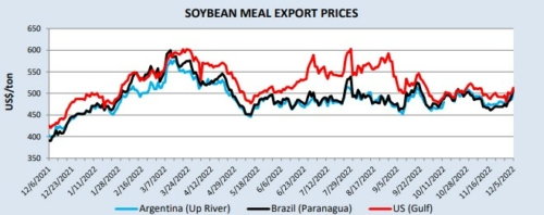 В ноябре средние цены на соевый шрот из Южной Америки были несколько ниже. Наценка на соевый шрот из США по сравнению с южноамериканским немного увеличилась в этом месяце, при этом цены в США незначительно выросли, в основном из-за сильного исчезновения на внутреннем рынке. Цены на соевый шрот начали расти в начале декабря из-за растущих опасений по поводу потенциальных потерь урожая в Аргентине, что может привести к сокращению переработки сои и снижению экспортных поставок, а также объявления о более низком, чем ожидалось, предложении США по производству биотоплива.