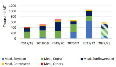 Прогнозируется, что импорт шрота в 2022/23 году сократится и останется ниже среднего показателя за 5 лет, поскольку внутренние поставки в настоящее время торгуются с дисконтом по сравнению с основными мировыми поставками. Кроме того, дополнительная тарифная квота на импорт соевого шрота закончилась 30 сентября без каких-либо признаков продления. Более низкие цены увеличат экспорт соевого шрота из Индии в 2022/23 году на 65 процентов по сравнению с предыдущим годом, что сделает его немного ниже среднего показателя за 5 лет.