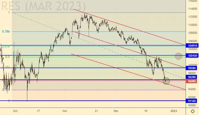 Рынок акций не может продемонстрировать нам ничего позитивного. Однако, мы продолжим надеяться на откат вверх, правда уже не к 105000, а к 102000. Купить можно с текущих уровней. Глобального позитива для нашего рынка нет, поэтому продажи на откатах вверх будут наиболее верной тактикой на данный момент.