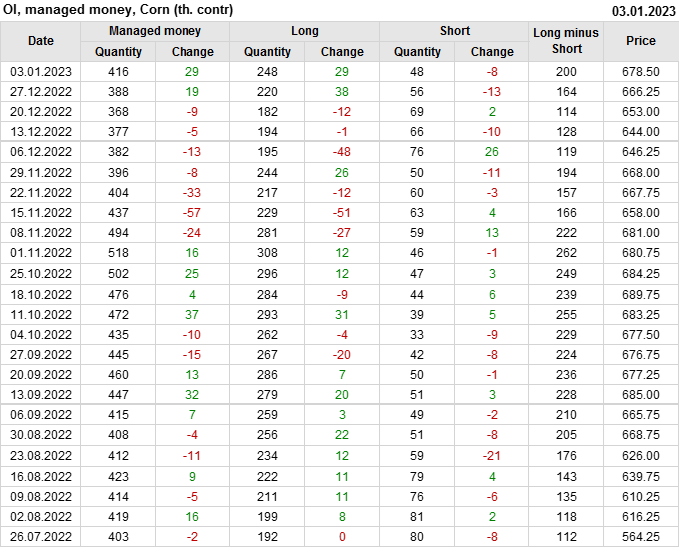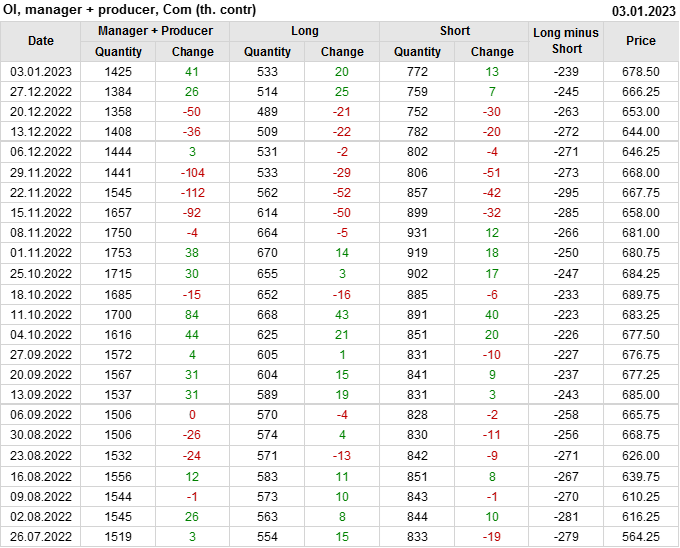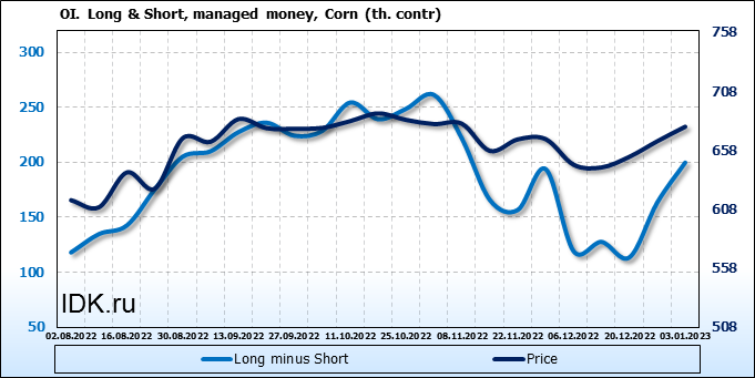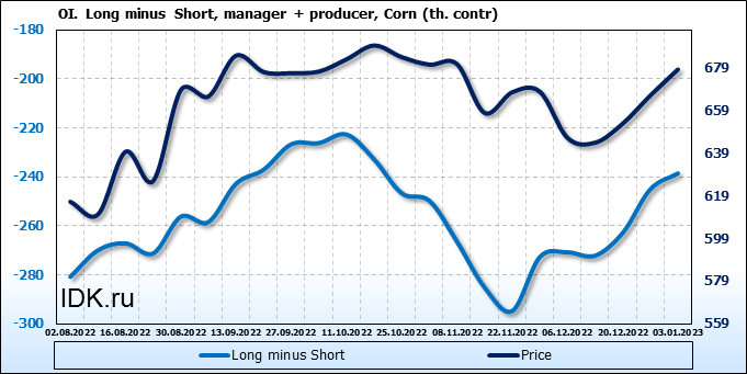 За прошлую неделю, 28.12.22 — 03.01.23, разница между длинными и короткими позициями управляющих увеличилась на 36.3 тыс. контрактов. В тоже время, цена выросла на 12.25 цента.